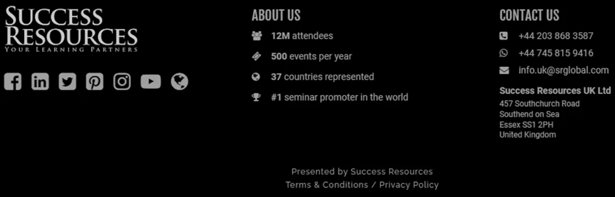 Disclaimer (I)In consideration of my participation in the above mentioned Event presented by Success Resources (*SR'), its Speaker/Trainer and its promoters, I hereby generally release SR and their agents, representatives, employees, promoters, successors, assigns, insurers and affiliated companies for any and all liability whatsoever related to SR's negligence, negligent conduct or omissions. Including any activity and indemnify each of the aforesaid from any loss or liability arising from any claim arising out of my participation in the event in general and in particular any activity. These releases shall not exclude any liability for death or personal injury caused by negligence or where such limitation or exclusion is not permitted by law.